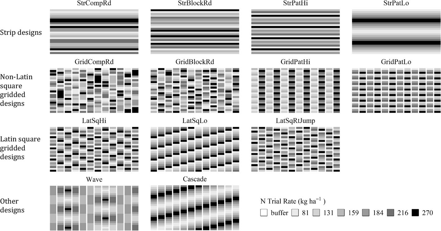 Illustration of some OFE trial designs, including strip-based, grid-based, Latin square, and gradient layouts. These designs support different analytical goals, such as treatment comparison, spatial modelling, and rate-response analysis (Li, Mieno, and Bullock (2023))