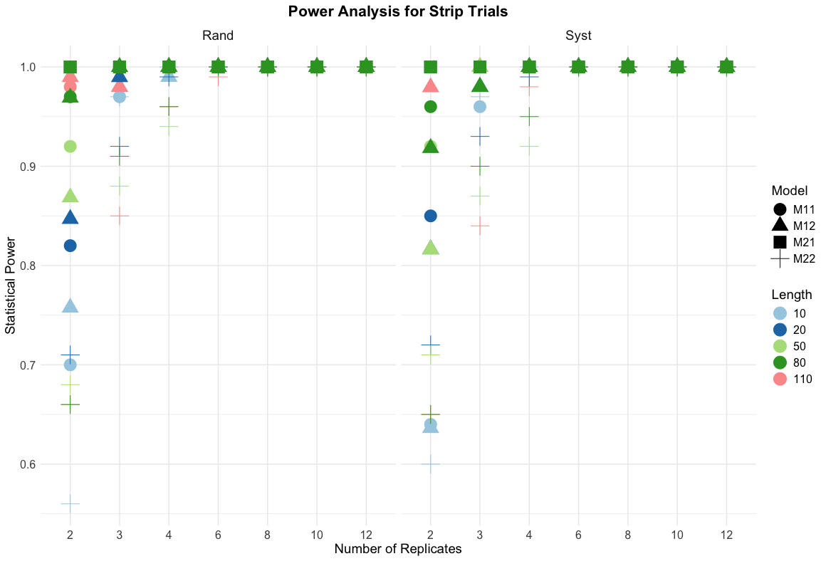 Strip length matters: Longer strips (\(\ge\) 500m) show consistent power improvement