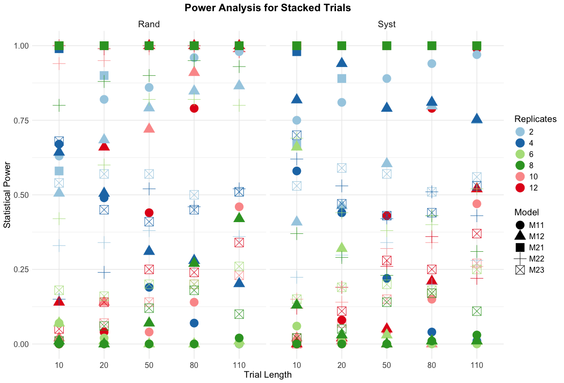 Practical recommendations: For stacked trials, prioritize M21 models with full data analysis and ensure adequate trial length (\(\ge\) 50m) for reliable statistical inference.