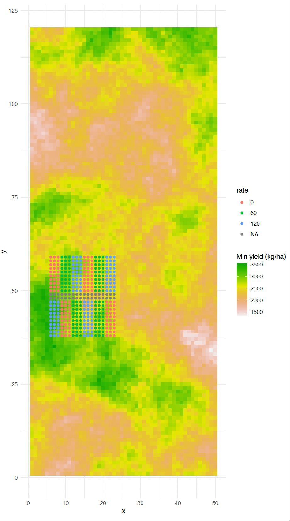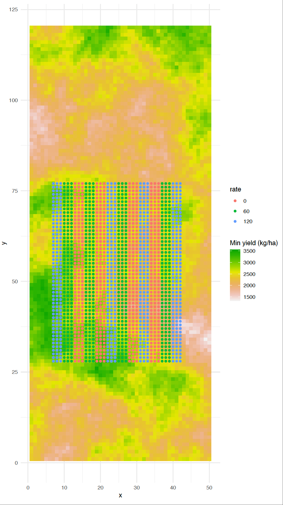 We simulate baseline yield using unconditional Gaussian geo-statistical simulation based on a first-order stationary random field model (Evans et al. (2020)). \[ z(s) = \mu + \varepsilon(s) \] where \(z(s)\) is the simulated yield at location \(s = (x, y)\), fertiliser trials are simulated using different designs and is added to the baseline yield: \[ y(s) = z(s) + \beta \times N(s) \]